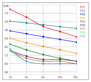 Graphs refer to singular activation of the instrument, in typical conditions of use. More advanced measurements are made within Level 2 of the profiling. The amplitude increase over time is not real, and is related to how the microphone works (sensitivity vs. sound pressure in spectral bands).